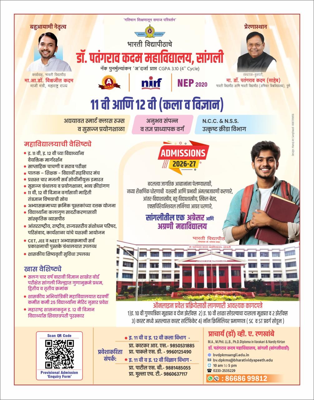 A prominent college in Sangli , under the wings of Bharati Vidyapeeth, marching towards empowering youth to face global challenges.
