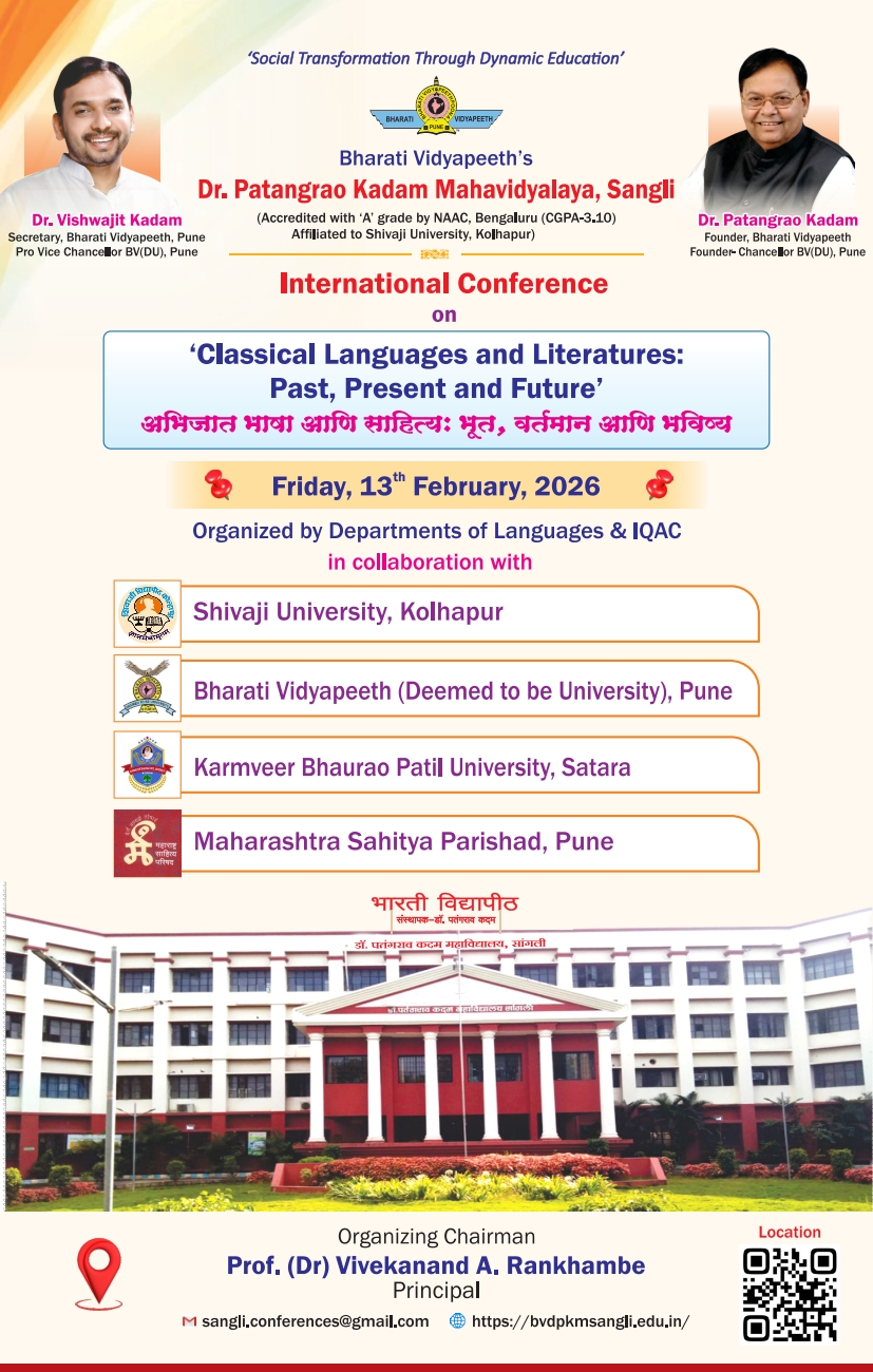 📢 Int’l Conf. Sangli (Maharashtra) India: Bharati Vidyapeeth's DPKMS International Conference on 'Classical Languages & Literatures: Past, Present & Future अभिजात भाषा आणि साहित्य: भूत, वर्तमान आणि भविष्य